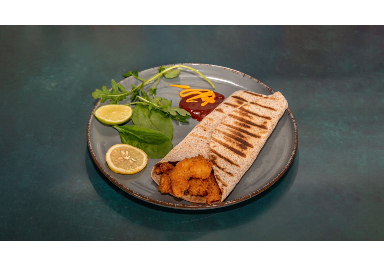 Dive into a Mediterranean adventure . Succulent prawns nestled among crisp green leaves, fresh salad, creamy hummus, and drizzled with smooth tahini sauce.