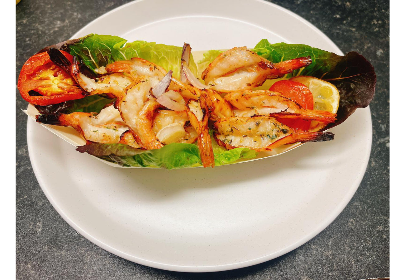 Seasoned and Grilled butterfly prawns on shells marinated in a mix of spices and olive oil.