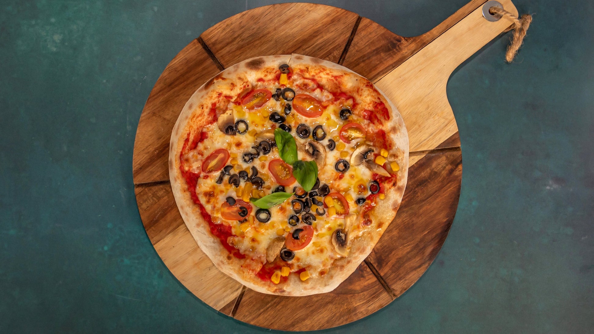 Take a stroll through a garden of tomato sauce, mozzarella, onions, olives & cherry tomatoes.